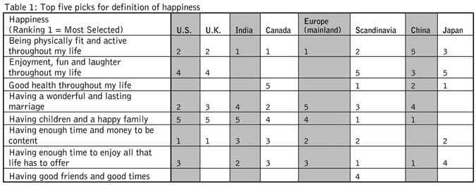 - Defining happiness: With increasing interactions between the members of the global village, the nascent trends in the local market have subtle but intrinsic differences. Children and family are notably more important to the Chinese and Scandinavians than to people from other regions. While people from Western countries strive for physical fitness and active lifestyles, those from China and Japan value good health in a general sense. A good marriage also remains in the top five ingredients for happiness, but is more essential to Americans and Canadians.
