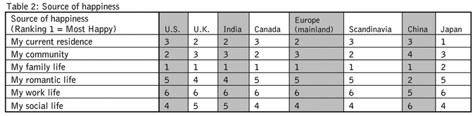When it comes to the specific things that make us happy, we are globally similar; we draw the most satisfaction from our family life, which is a dramatic shift from 20 years ago when satisfaction was primarily associated with success in the professional realm. Work life is becoming a markedly low priority and source of happiness in the lives of consumers around the globe. Although people’s satisfaction with their residency and community is comparable across countries, people from the U.K. and Europe are more inclined to live in another country and Americans are the least inclined to do so.