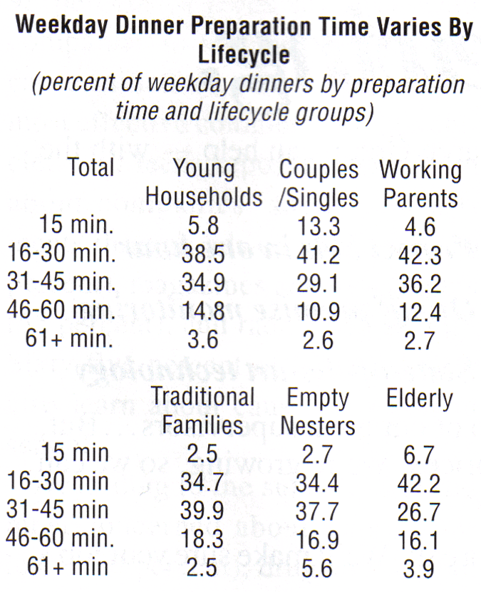 While younger couples/singles, working parents and the elderly skew to quicker meal preparation (16-30 minutes), traditional families are apt to spend more time preparing an average weekday dinner (31-60 minutes). NPD data show that although people are increasingly simplifying weekday meal preparation, they are willing to spend more time on weekend meals, taking an average of 31-45 minutes for meal preparation.