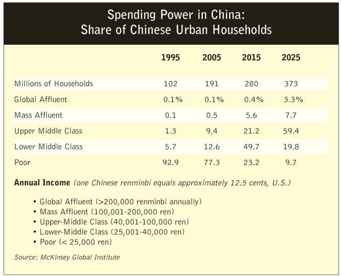 Consumers in China’s urban-affluent segment earn more than 100,000 renminbi (about $12,500) a year and command 500 billion renminbi, nearly 10 percent of urban disposable income, despite accounting for just 1 percent of the total population.