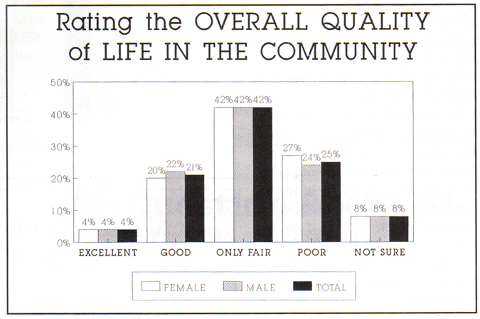 Similarly, 32% of Hispanics polled gave the quality of education a good-to-excellent rating as compared to 56% of the general population. Thirty-six percent of Hispanic respondents versus seven percent of the general sample regard the crime situation as "very serious" with more Hispanics than non-Hispanics citing a noticeable worsening during the last two years.