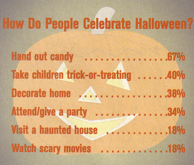 Sixty-one percent of Americans have someone in their household who participates in Halloween festivities, according to a Maritz Poll from Maritz Marketing Research Inc., St. Louis. While Halloween is typically thought of as a holiday for small children, 39 percent of those getting caught up in the Halloween hoopla are 45 and older. The survey also showed handing out candy, 49 percent; while taking children trick-or-treating, 27 percent; work, 26 percent; school, 7 percent. Almost half of respondents (48 percent) also have children in their household that will dress up in a disguise.