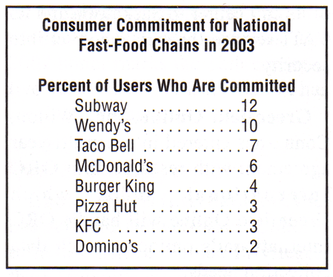 Despite heavy investment in marketing, fast-food consumers show a very weak commitment to national fast-food chains, according to a study conducted by TNS Intersearch, Horsham. Pa. Of the national chains, Subway and Wendy’s have the highest consumer commitment. McDonald’s and Burger King have a weaker base of committed customers, and a high proportion of consumers at risk of defecting - this despite the fact that the larger chains spend more on advertising (a combined $909,439,500 versus a combined $498,712,900 for the year 2002, according to TNS Media Intelligence/CMR).