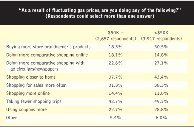 The survey showed that the leading gas/money-saving strategies employed by consumers making above and below $50,000 per year include taking fewer shopping trips, shopping closer to home and shopping for sales more often.