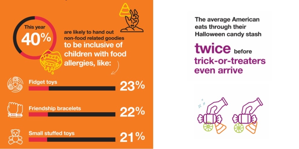 The survey found that the average American eats through their Halloween candy twice before trick-or-treaters arrive and 24% confess they’ve had to restock three times or more. Sixty-two percent of Americans consider themselves “Halloween people” with Gen Z and Millennials leading the way. While candy continues to be the top item to hand out, 40% are likely to give non-food related items to be inclusive of children with food allergies. These items include fidget toys (23%), friendship bracelets (21%) and stuffed animals (21%).