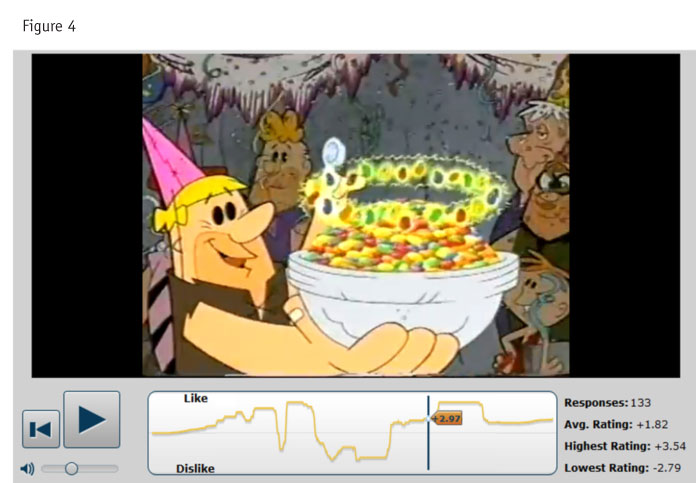 And if the stimulus is a video as opposed to a static image, such as a TV commercial, dial-testing is arguably the best technique to evaluate this kind of stimulus. It directly shows at what point during the span of time of the commercial (e.g., 30 seconds, 60 seconds) participants liked or disliked the ad and is usually utilized after a finished commercial has been developed and about to air (Figure 4).