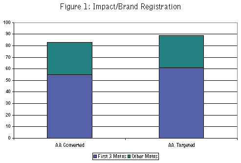 Impact/brand registration (Figure 1): Impact, measured by unaided recall of the test ad in the first three mentions after exposure to the ad in the fourth (middle) position of an exposure to seven commercials, and brand registration, measured by total unaided recall of the test ad after the clutter, are somewhat enhanced for targeted African-American advertising relative to converted general-market advertising.