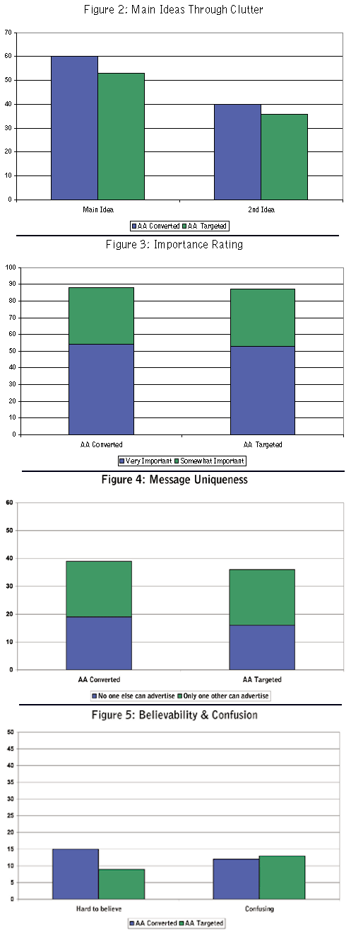 Comprehension (Figures 2-5): While product messages are less likely to be played back in targeted versus converted ads, those messages are comparable in importance, uniqueness and clarity and are more credible in targeted advertising.