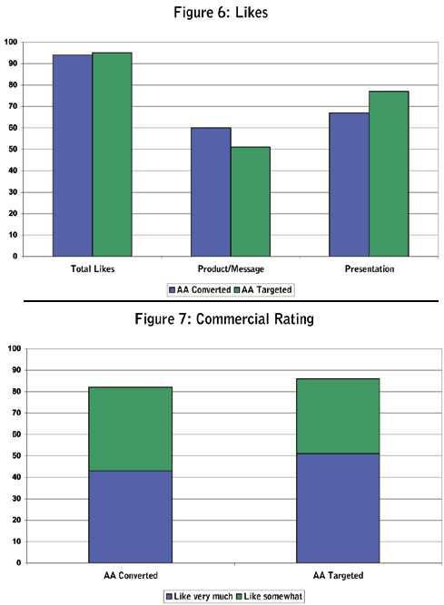 Appeal (Figures 6-7): As one might expect, African-American audiences are more attracted to how the message is presented in targeted versus converted ads since targeted ads generally contain cues and symbols unique to African-American culture. Their greater focus on presentation elements in targeted ads explains their lower playback of product sales messages noted above. Overall, targeted ads are more appealing to African-Americans than converted general-market ads.