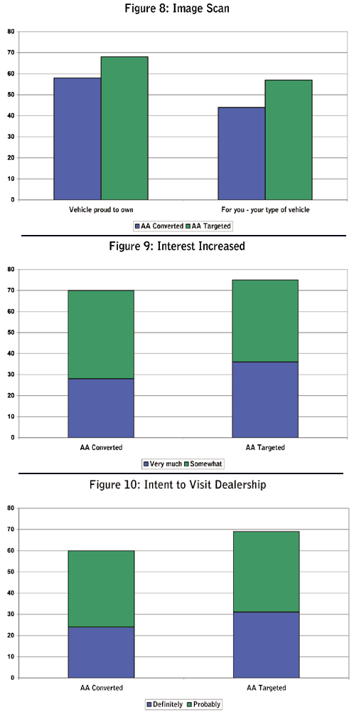 Motivation (Figures 8-10): African-American audiences rate brands in targeted advertising more favorably and appear to be more motivated to action by targeted advertising than converted general-market ads.