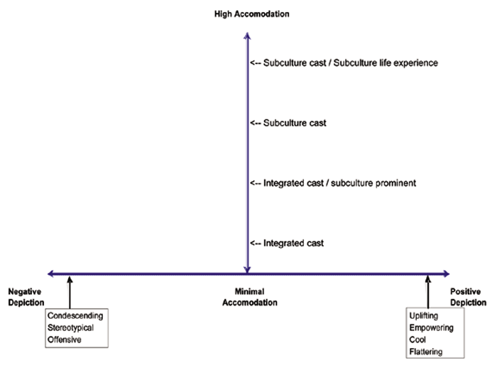 The quality of accommodation dimension ranges from positive to negative. The range reflects the degree to which the subculture is perceived to be depicted in a positive or negative light. Positive depiction might be described as uplifting, empowering, cool or flattering while negative depiction might be described as stereotypical, condescending or even offensive. Note that the effectiveness of advertising that is positioned high on the degree of distinctiveness dimension can be undermined by poor performance on the quality of distinctiveness dimension.