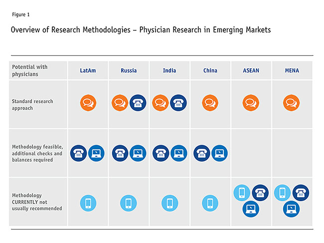 Which methodologies work where? Figure 1 provides an overview of the methodologies – qualitative; telephone; mobile; online – that are commonly used to conduct interviews with physicians and those which are used less frequently (where greater checks and balances are required). While some of the newer methods using mobile phones for data collection are feasible, they are not yet to be recommended for use in emerging markets for health care, as physicians are still not comfortable with these methods. Having said that, this may become a standard research approach in the future.