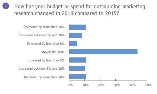 It was status quo for readers’ MR outsourcing budgets as well: 44 percent reported no change; a collective 24 percent reported decreases between less than 5 percent and more than 10 percent and 32 percent cited an increase of less than 5 percent and more than 10 percent. 2