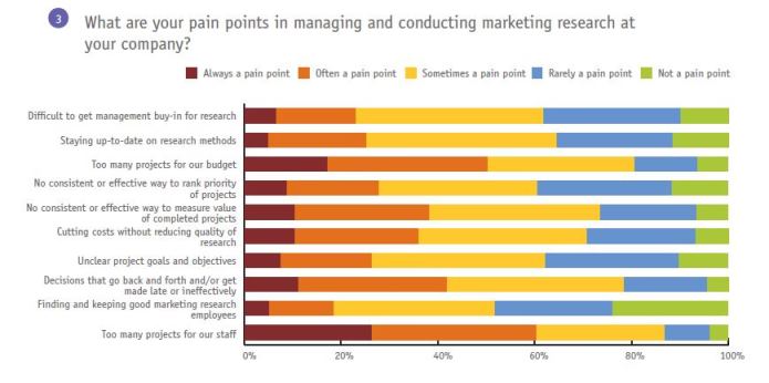 Familiar notes were also sounded in response to a question about pain points in managing and conducting marketing research.