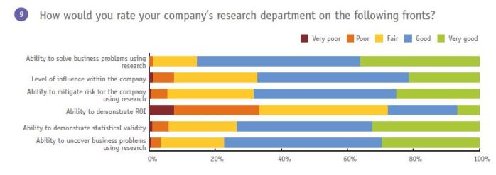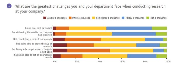 When asked about challenges faced by their departments, not being able to prove the ROI of research, not being able to get insights acted upon and not completing projects fast enough were the top three situations labeled as “always” being a challenge. 4