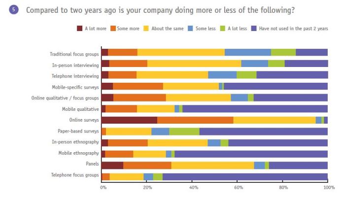 In each iteration of the CRR we’ve asked some variation of a question or questions designed to understand the usage and perceived efficacy of new and existing methods. This time around – and with an eye toward the fact that change doesn’t happen quickly – we asked respondents to tell us how much they were using selected traditional MR methods compared to two years ago. Not too many surprises here, as tech- or Web-based methods such as online surveys, panels, online qualitative/ focus groups and mobile-specific surveys garnered the most “a lot more” usage mentions. In the “a lot less” camp were paper-based surveys, traditional focus groups, telephone interviewing and in-person interviewing, respectively.
