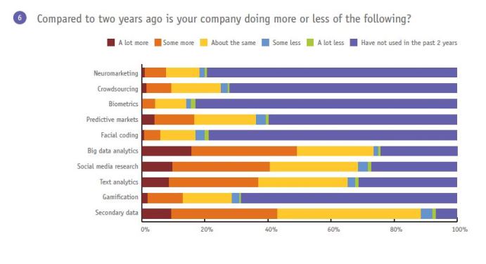 For a similar question on newer, buzzier methods, the top choices in the “doing more of” arena were big data analytics, social media research, secondary research (not exactly a new method!) and text analytics. The methods with the highest percentages of respondents saying they have not used them in the past two years were biometrics, neuromarketing, facial coding and crowdsourcing, perhaps indicating that their appeal may remain at niche levels for the foreseeable future.