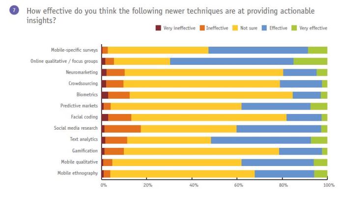 As to a method’s effectiveness, online qualitative/focus groups, mobile-specific surveys and text analytics earned the three highest combined “effective/very effective” totals, with predictive markets and mobile qualitative tying for the next position. Social media research, facial coding and biometrics earned the three highest combined “very ineffective/ ineffective” totals. Tellingly, for about half of the methods, the percentages of those who were not sure of their effectiveness were above 60 percent, perhaps another factor contributing to the difficulty of proving the ROI of MR. 5 6 7