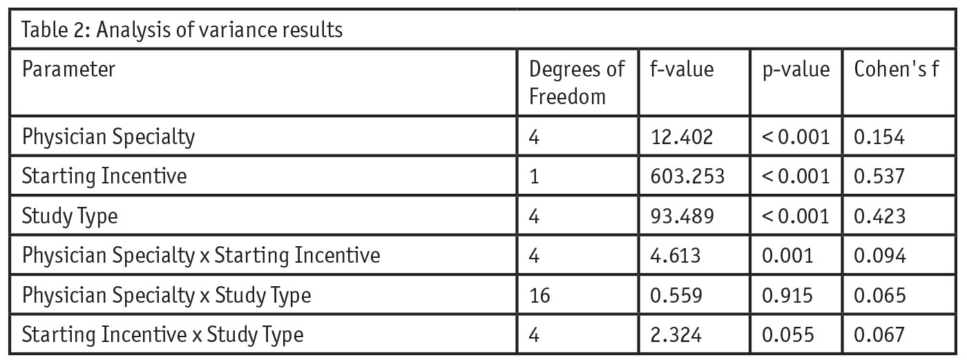 To formally test the impact of incentive amount on participation given study type and physician specialty, an analysis of variance (ANOVA) was utilized with reservation price as the dependent variable and study type, physician specialty and starting incentive amount as the independent variables. Given this analytic plan, sample sizes for the five physician specialties were determined apriori as n = 85 to provide adequate statistical power (80 percent). Due to sampling restrictions, our final sample sizes were close to this requirement with n = 84 for cardiologists and orthopedists, n = 86 for neurologists and oncologists, and n = 85 for PCPs.