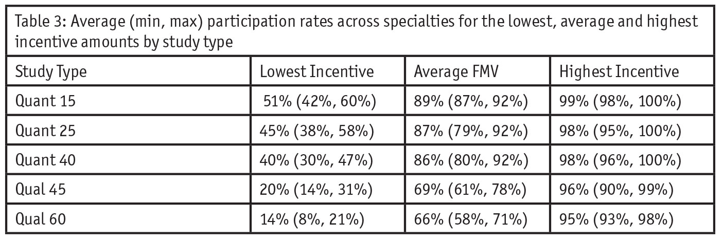 Turning to participation rates (Table 3), we see that the 15-minute online quantitative study has the highest participation rate at the average FMV. As the time commitment increases, participation at the average FMV rate decreases; the higher FMV rates for these studies are not enough to compensate for the time and perceived effort. For all studies other than the 15-minute quantitative study the average participation rate drops below 50 percent at the lowest incentive amount. Further, when comparing the 40-minute online quant versus the 45-minute telephone IDI we see a large difference in participation rates at both the average FMV and lower incentive amounts. While the 45-minute telephone IDI receives a higher incentive for the additional five minutes of time (~$20 on average) this is not enough to compensate for the effort and scheduling commitment required for a telephone IDI. Similarly, while respondents receive a higher incentive for a 60-minute in-person IDI (~$60 on average) we see even lower relative participation rates as compared with a 45-minute telephone IDI; the additional incentive is incongruous with the additional time commitment. Lastly, we see that participation rates meet the 75 percent threshold at the average FMV for quantitative studies but not for qualitative studies.