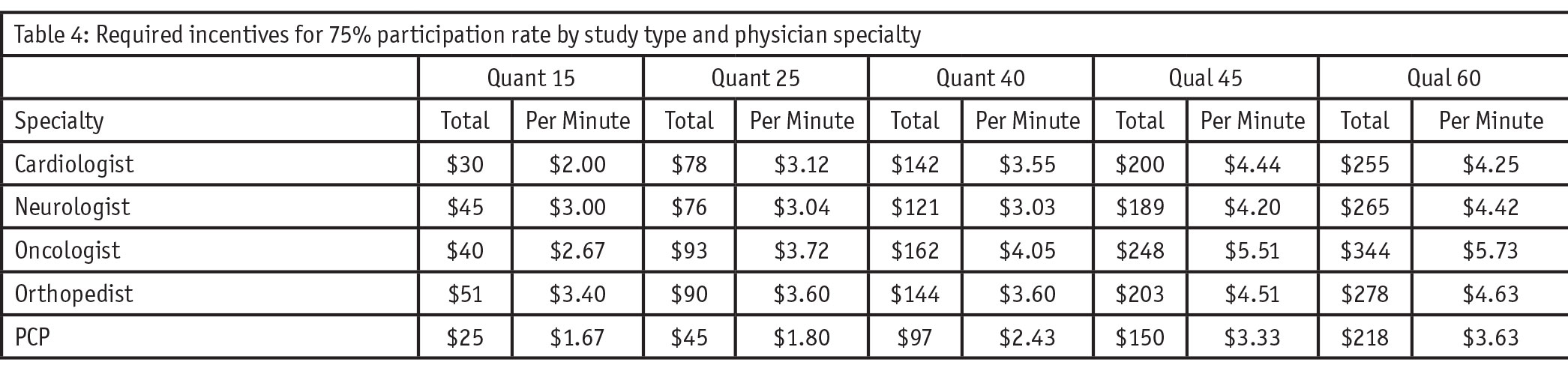 Even with these limitations, there is opportunity to leverage these results as guidance in determining your FMV strategy. Participation rates cannot be ignored and we must recognize that participation is greatly impacted for qualitative studies given the increased effort required for participation. Our research provides per-minute incentive guidance for our targeted specialties by survey type as a practical guideline to achieve 75 percent participation levels (Table 4).