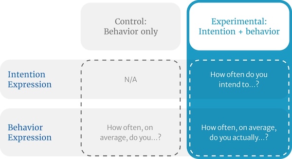 In our survey-based experiment, we wanted to test the hypothesis that, by giving respondents the opportunity to first express how often they intend to engage in a behavior, they will subsequently report actual behavior frequency more accurately.