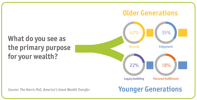 - Older generations see wealth primarily as a path to security (42%) and enjoyment (35%). Younger generations, while still valuing security, are significantly more motivated by legacy building (22%) and personal fulfillment (18%).