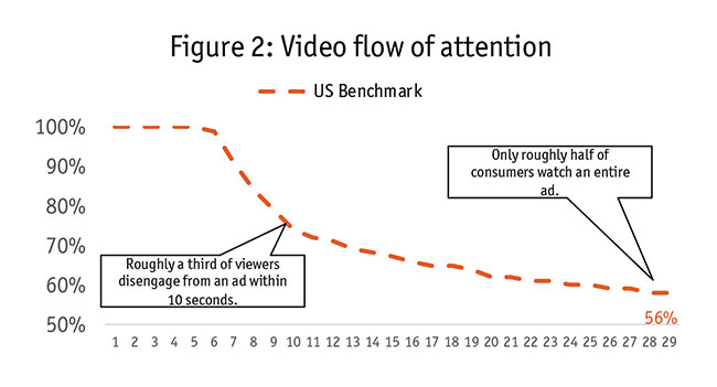 The 50 percent conundrum. Only roughly half of consumers ever look at a banner ad when exposed to it (Figure 2) and roughly the same number watch an entire video ad. While of course we need to know how many are exposed to an ad, it clearly is imperative to also understand how ads attract attention.