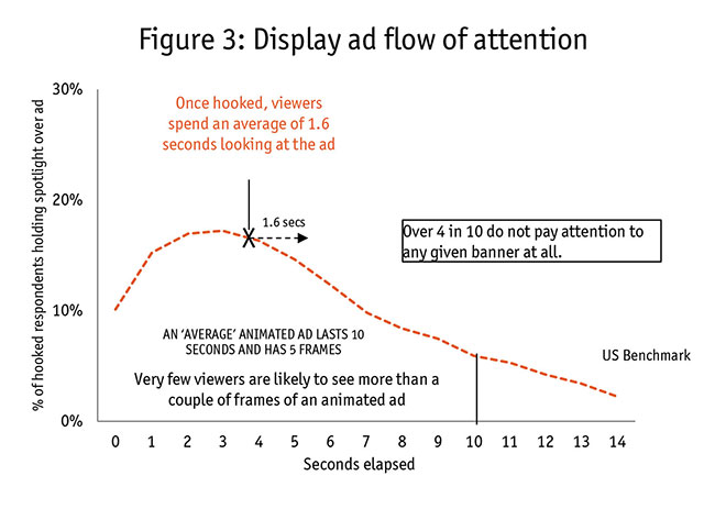 Brief encounters. On average, consumers only spend 1.6 seconds looking at banner ads. With the growing trend to use animated rather than static banners, this means that consumers are typically only seeing one to two of the frames (Figure 3). Therefore, it is not surprising that animated banners have lower branding than static banners. We have found that animated ads with fewer frames are actually more effective.