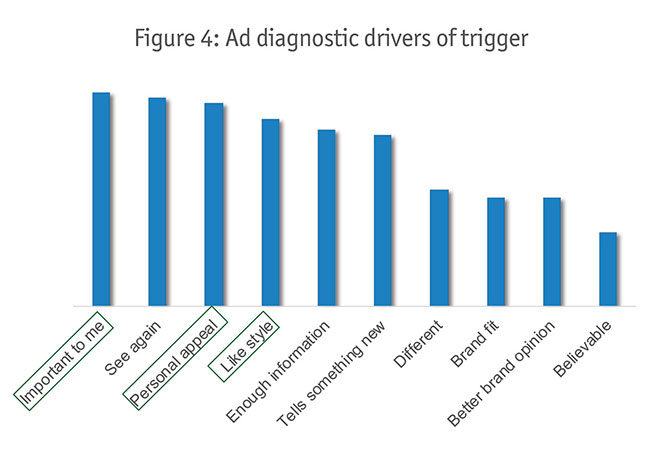 Making it personal. Often ads focus on interesting creative ideas or key product benefits. But we have found that if either of these is not personally relevant to the viewer the impact of the ad diminishes (Figure 4).