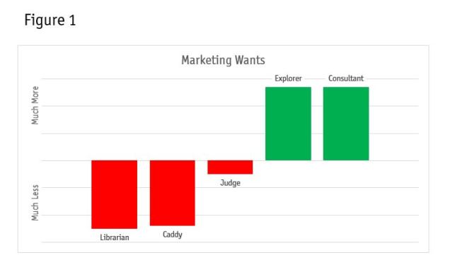 1. With marketing, categorize current and desired insights work into five roles. Understand the roles, or portfolio of roles, marketing teams expect from your insights team. Are you librarians, caddies and judges, or are you explorers and consultants? Explore what activities insights is and is not engaged in, what deliverables are desired but missing and decisions or actions marketing expects to take based on these. Long-held assumptions about who owns what pervade all organizations. It’s necessary to consistently reappraise and realign with stakeholders on the role our function plays. Ultimately, all departments own business growth.