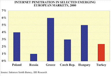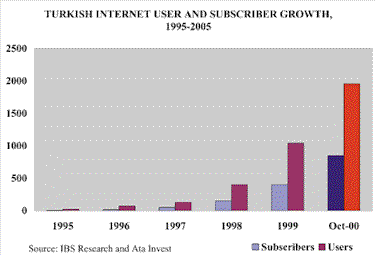 This is why some international investors and financial institutions place Turkey at the top of their emerging European league for Internet investment opportunities. Analyses by several brokerage houses project for Turkish ISPs the highest future values in the region. Underpinning such valuations are Turkey’s large and young population, its overall strong economic growth, and possible access to the further 40 million Turkic-speaking peoples in the Central Asian republics.