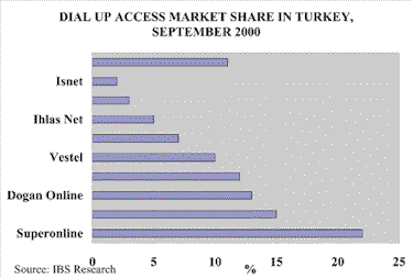 Among ISPs, Superonline currently dominates the market, though tough and well-funded competition is catching up fast. There are about 80 ISPs in Turkey, but the top five command a combined 72 percent share of the market as of October. Consolidation is expected, leading to the long-term presence of possibly five companies competing for residential and corporate access, the latter, evidenced by the considerable ignorance of Turkish companies exposed in IBS’s Business User Survey2, a niche with considerable growth potential. “The corporate market will grow in an incredible way. Companies will soon have to have a Web site and will have to provide services on that Web site. Furthermore, they must go beyond presenting their products on the Web to selling their products there,” says Ahmet Dalman, CIO at Dogan Online.
