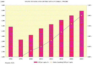 These forecasts suggest that the share of online spending in per capita GDP will be 2 percent in 2005. In 1999, e-commerce spending in Turkey was around $1 million. In 2000, the Koc Group’s Kangarum targets earning that revenue each month.