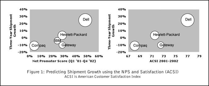 Researchers, pointing out the NPS claims are only supported by Reichheld and his co-developers, have conducted rigorous scientific research on the NPS, with startling results. For example, Keiningham et al. (2007), using the same technique employed by Reichheld to show the relationship between NPS and growth, used survey results from the American Customer Satisfaction Index (ACSI) to create scatter plots to show the relationship between satisfaction and growth. Looking at the personal computer industry, they found that satisfaction is just as good as the NPS at predicting growth (see Figure 1). Keiningham et al. (2007) found the same pattern of results in other industries (e.g., insurance, airline, ISP). In all cases, satisfaction and NPS were comparable in predicting growth.