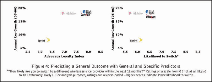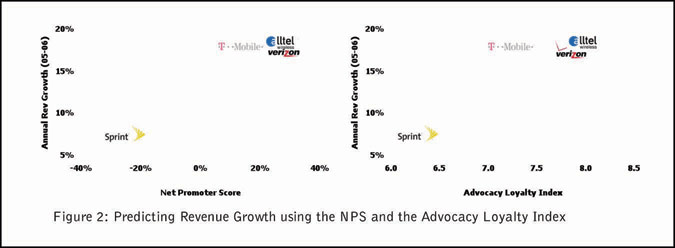 Figure 2 shows that the NPS and the ALI are similarly related to revenue growth2. T-Mobile, Alltel and Verizon, all with high ALI or Net Promoter scores, have faster revenue growth compared to Sprint, which has a lower ALI and NPS.