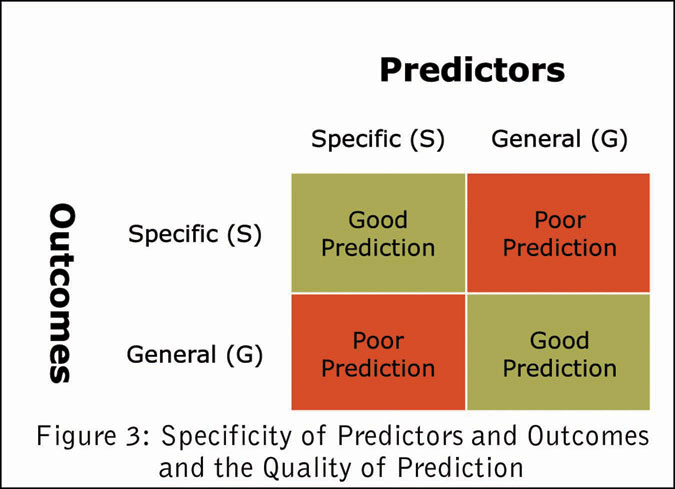 The predictability is improved when the specificity in the predictor and outcome are the same (Figure 3). That is, specific outcomes are best predicted by specific measures. As an example, an employee’s intention to quit his/her job is a better predictor of whether or not that employee actually quits compared to general measures of employee satisfaction. Conversely, general outcomes are best predicted by general measures.