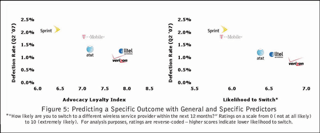 When we predict a more specific outcome, we see a different pattern of results (Figure 5). Likelihood to switch (specific predictor) is better than advocacy loyalty index (general predictor) in predicting defection rate (specific outcome). Likelihood to switch is a better predictor because it is specific and targeted to the outcome of interest.