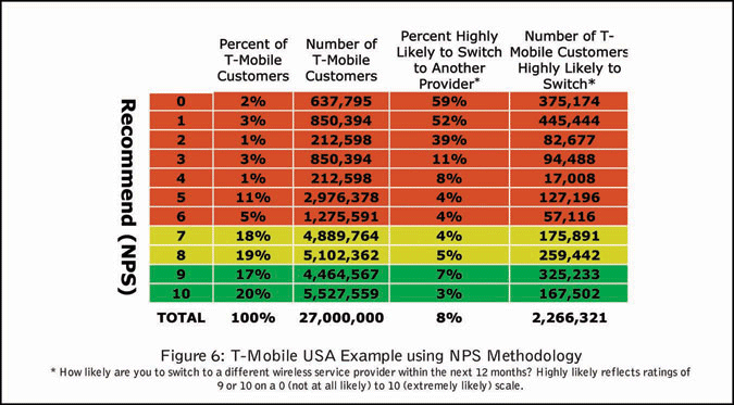 Relying solely on NPS to manage customers would result in missed opportunities to save a large number of at-risk customers from defecting. This mismanagement of customer relationships in the wireless industry, where defection rate is a key business metric, can be detrimental to revenue growth. Using Q2 2007 data for T-Mobile USA (Figure 6), it is estimated that, of non-detractors, over 900,000 T-Mobile USA customers are still likely to switch to another provider, with a potential annual revenue loss of over $29 million3!