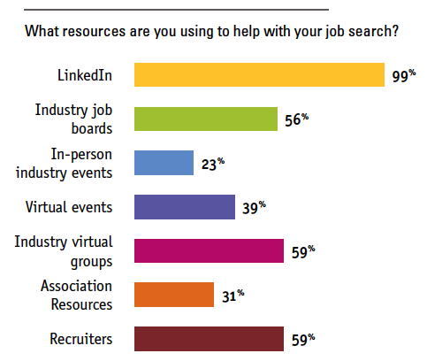 LinkedIn was the most helpful platform, used by 99% of unemployed respondents. Industry virtual groups (59%), recruiters (59%), industry job boards (56%) and virtual events (39%) were also helpful when searching for a job. Thirty-one percent found association resources beneficial while others turned to in-person industry events (23%).