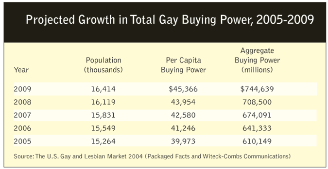 Understanding buying power is indisputably useful for economists, business executives and public policy analysts, and for those of us who wish to calculate market potential and emerging market opportunities. With $610 billion in estimated buying power for gays, lesbians and bisexuals, it is no surprise that many Fortune 500 companies are investing more each year to tap this profitable potential.