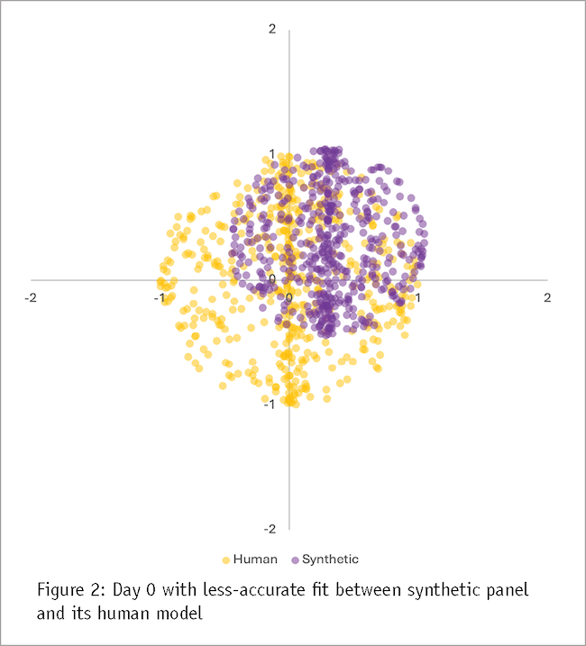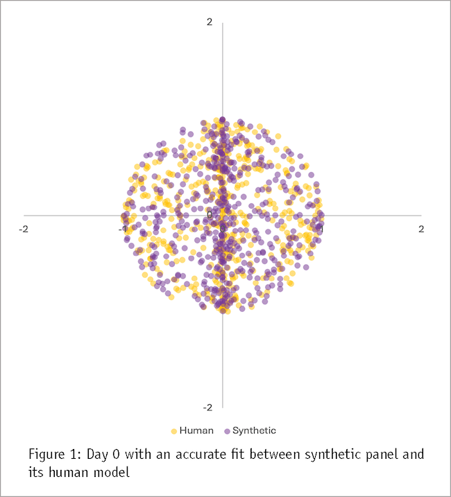 As a starting point (Day 0), imagine that we could construct a synthetic panel model that would answer all research questions as accurately as a human panel. Further, from the aggregate data perspective, the outputs of the two models would look indistinguishable in their means and variances. Figure 1 shows what such an accurate match could look like at the time immediately after the synthetic panel is constructed to match a human panel at that point in time.