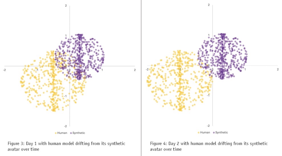 Ultimately, after more time elapses, the human and synthetic models no longer overlap, and one can conclude that answers provided by the two models over time may diverge enough to produce incongruent results: the synthetic panel has decayed beyond its useful shelf life.