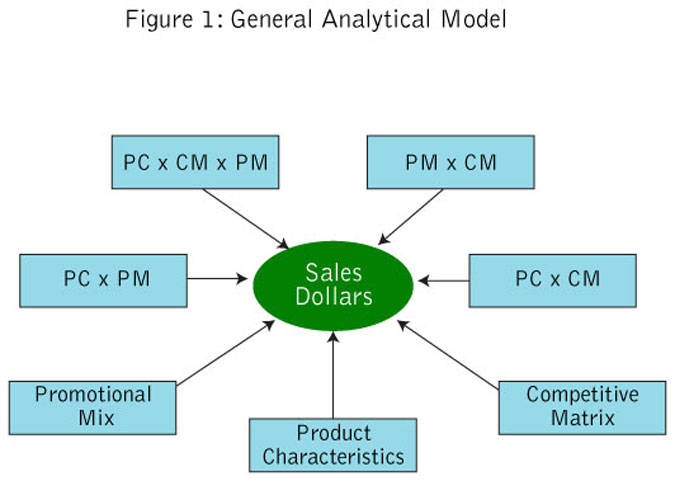 Sales Dollars = Product Characteristics + Competitive Matrix + Promotional Mix + (Product Characteristics x Competitive Matrix) + (Product Characteristics x Promotional Mix) + (Competitive Matrix x Promotional Mix) + (Product Characteristics x Competitive Matrix x Promotional Mix)