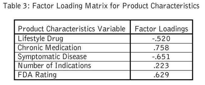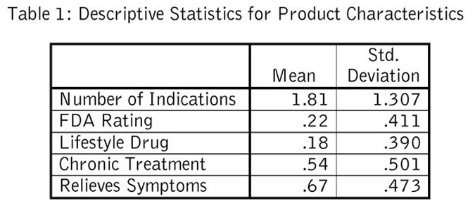 Secondary data were provided by IMS (IMS Health, 2004a). Primary data were also collected from five clinical pharmacists who were asked to classify each drug according to three types: lifestyle, chronic, treating symptoms. The pharmacists’ classifications were collected in a Delphi approach and resulted in consensus assignments of each drug to these three product characteristics. Finally, a variable for size of company portfolio was created from the secondary data. The data were coded, entered into SPSS and checked for errors. The data file represented the three categories of independent variables presented below along with their range of values.
