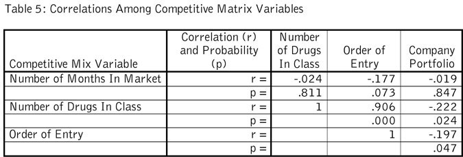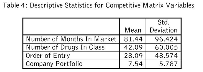 The competitive matrix is more complex than product characteristics in terms of effects on sales and includes such variables as order of entry. Later entry may be expected to have a negative impact on drug sales because drugs launched earlier into a category will likely have established a good position and have loyal customers. Doctors and patients tend to recognize the first brand as the gold standard. The number of drugs in a category may also have a negative impact on sales because if there are many drugs, the competition will be fierce and market share for each brand will decrease. Finally, the number of drugs a company has in its portfolio should provide a stronger market position and generate more sales.