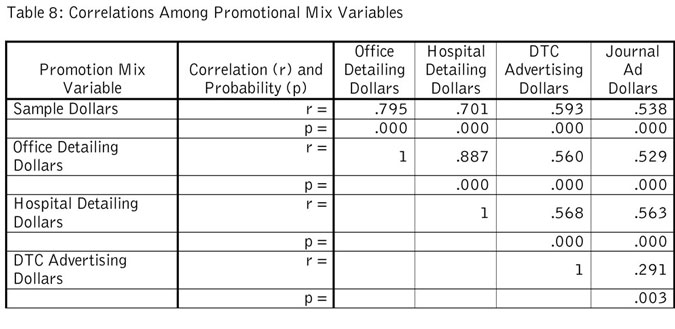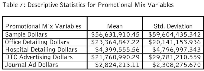 Promotional mix has been studied more in pharmaceutical sales than any of the three sets of variables. For example, the first promotional study done in pharmaceutical marketing was done in 1954 and it looked at the effects of medical journal ads, detailing by sales representatives, providing physicians with peer-reviewed journal articles, and sampling (Rogers, 1962). Here, we will look at the amount of money expended on hospital and physician office detailing. Office detailing has a positive impact on sales because it can not only promote the doctors’ understanding of the drugs but also enhance their friendship with the reps and their trust in the brands and the companies.