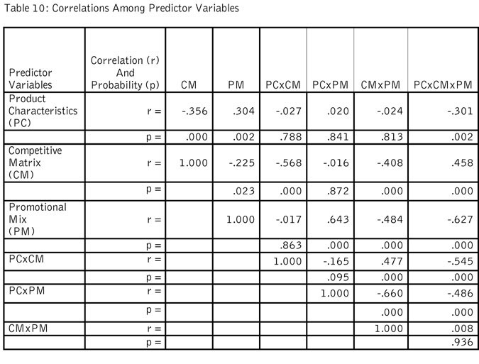 Because of the significant correlations among the factor score predictor variables and their interaction terms, stepwise multiple regression was the method of choice to determine the unique value of each predictor in predicting sales dollars. The stepwise regression model yielded an r-square of .668 that was significant overall (p<.0001). The significant predictors of sales dollars were product characteristics (standardized) ß = .155, p<.060), promotional mix (standardized) ß = .695, p<.0001), and the interaction of these two factors (standardized) ß = .279, p<.032).