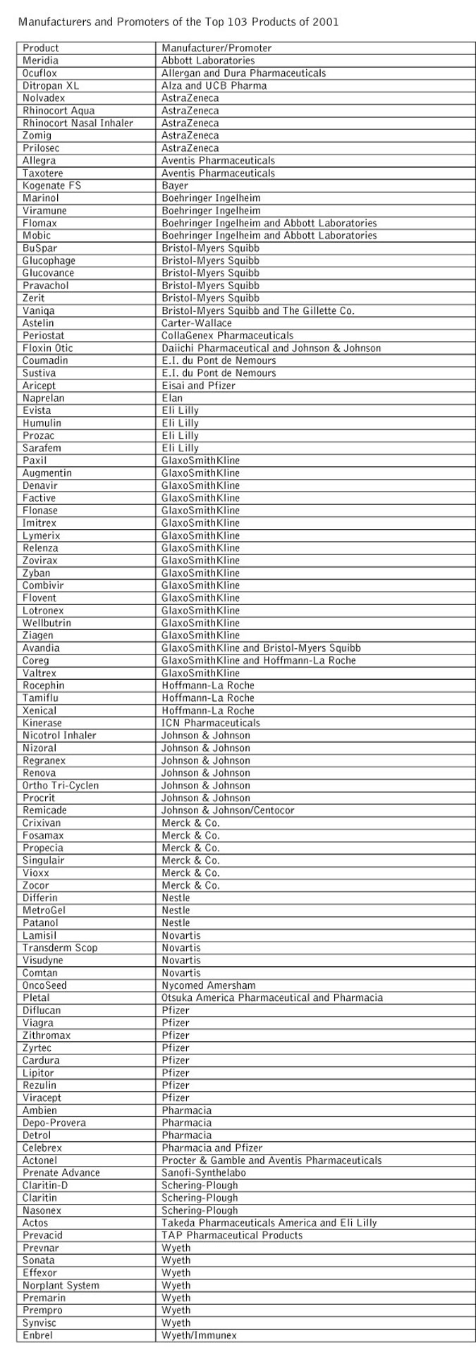 Both secondary and primary data were collected for 103 top products from 2001. (Please see below for the complete list.) Some of these products have gone generic (Claritin), some have been taken off the market (Vioxx) and some have been acquired by other companies (Sustiva) since the data set was created. However, the relationships explored in this research are not affected by these events.