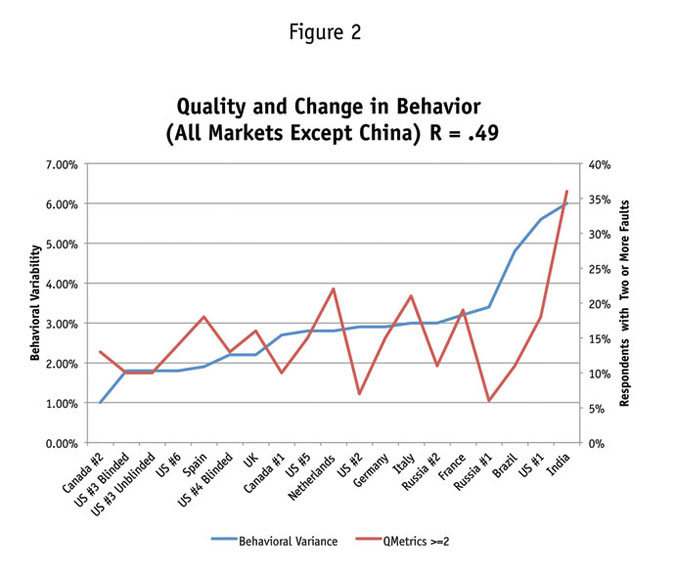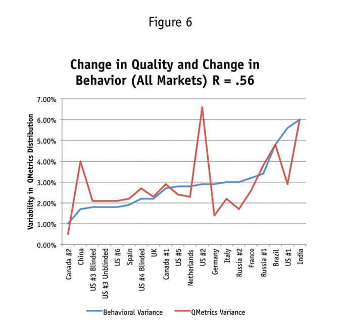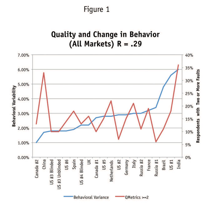 Metrics for calibrating engagement levels have been increasing in use during the past five years. One particularly elegant proposal came from Garland (2012), an outlier detection system. Our QMetrics took its early form (Gittelman and Trimarchi, 2009) from a paper presented at CASRO (Courtright, M. and D. Brien, 2009). With some changes, we adopted this QMetrics score to fit the test instrument that we have deployed in 35 countries where we audited over 300 online panels as part of the Grand Mean Project. Respondents were subjected to two consistency questions, one trap question and an analysis of speeding and straightlining (also known as non-differentiation) as a part of the QMetrics scale we deployed for this study. We quota-controlled demographically-balanced samples among the 20 panels willing to participate in the process from 2008 to the present as they conducted repeated waves of a tracking study.